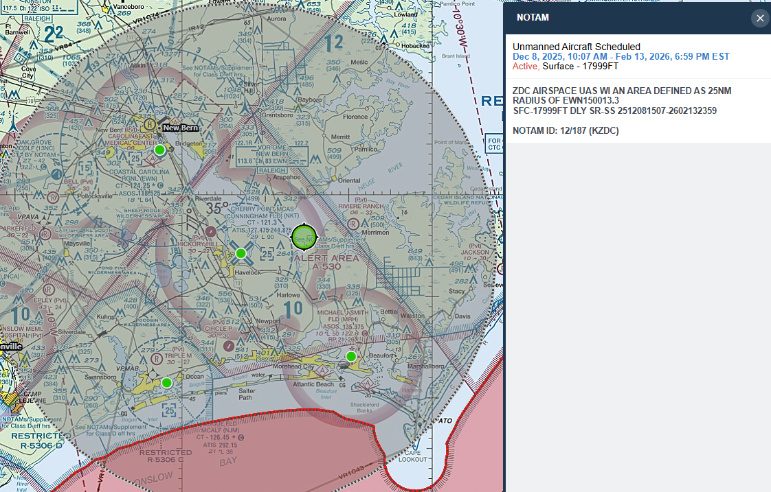 Take this NOTAM near Cherry Point for example. UAS operating during all daylight hours, in this 50-mile-across ring, from the surface to 17,999 ft...very helpful!