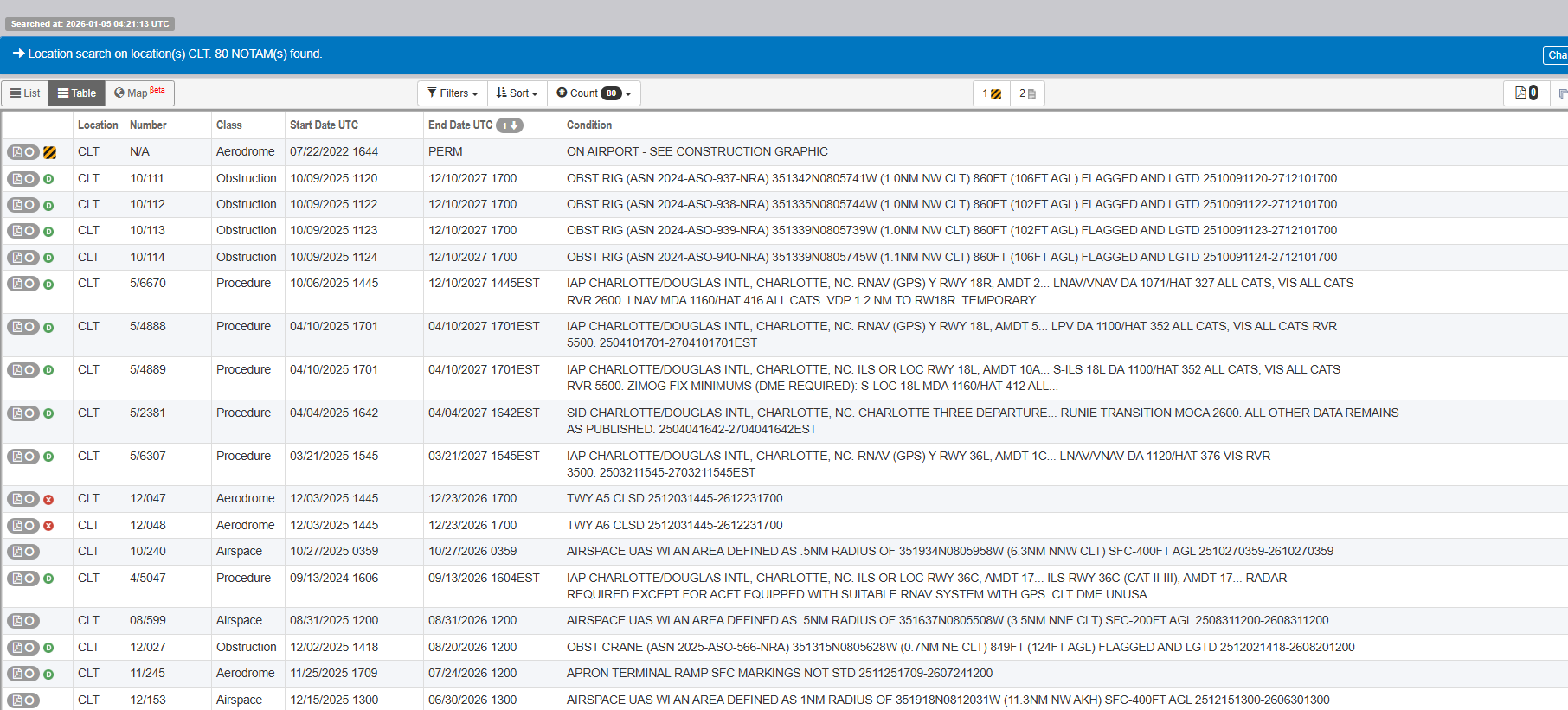 At any big airport, the list of NOTAMs is so long and full of next-to-worthless things that it makes sorting into usable information nearly impossible. CLT returns 80 results. LAX, 85. EWR, 126 NOTAMS! That's 126 vague, barely english reports that you technically would need to read before landing at EWR. Hope you've got Foreflight or some other tool to help you with that. Fun fact, if you plan a flight from EWR to JFK (an 18 mile route if you bribed the controllers to let you fly direct), the FAA system returns 374 NOTAMs that you should read. Good luck!