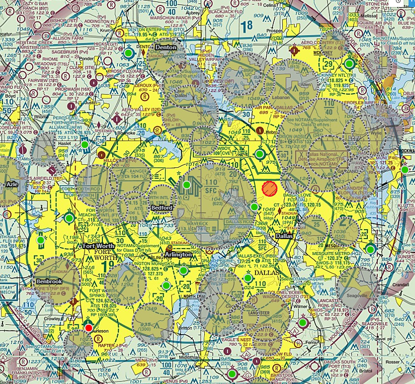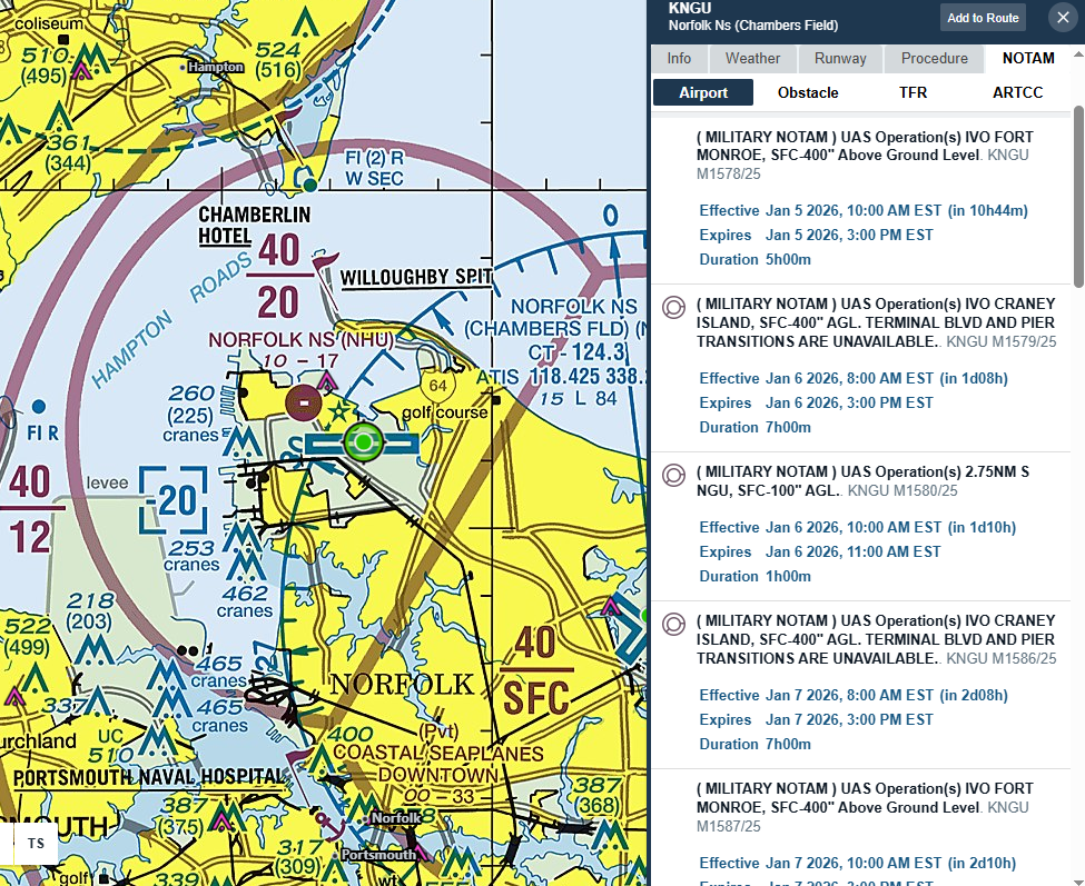 Here's an example where multiple military NOTAMs for drone operations aren't shown graphically at all! The only way you'd know about them would be if you selected KNTU and checked the NOTAMs tab. And why, you might be wondering, would you ever need to be checking NOTAMs at an airport you'd never be landing at?