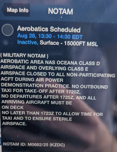Here's an example of a military NOTAM issued for a 3 mile radius of the Fort Story lighthouse (about 5.5 miles North of NTU). However, since the Military NOTAM text is different than civilian, Foreflight doesn't recognize its location properly and just displays a 5 mile ring centered around NTU itself. (Luckily in this case ORF has a repeat NOTAM that gets the location correct for Foreflight to display.) This same location issue often comes up with parachute operations too, with NOTAMs issued around the base airport, but not the dropzone itself.