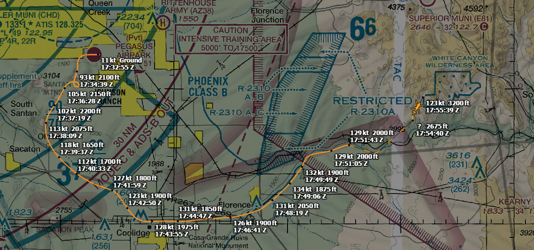 The wire struck was a 'slackline', specifically a high slackline. A high slackline allows enthusiasts to balance on a line in a similar fashion to a tight-rope walker for sport. In this case, a line was strung over a canyon in Arizona, about 45 miles ESE of Phoenix. This low-level canyon route was one familiar to the pilot. While at this time it is unclear exactly the altitude he struck the wire, ADSB data suggests he may have been as high as 500-700 feet AGL. This is corroborated by the NOTAM for the wire (more on that later) which states that the wire is at 600AGL.