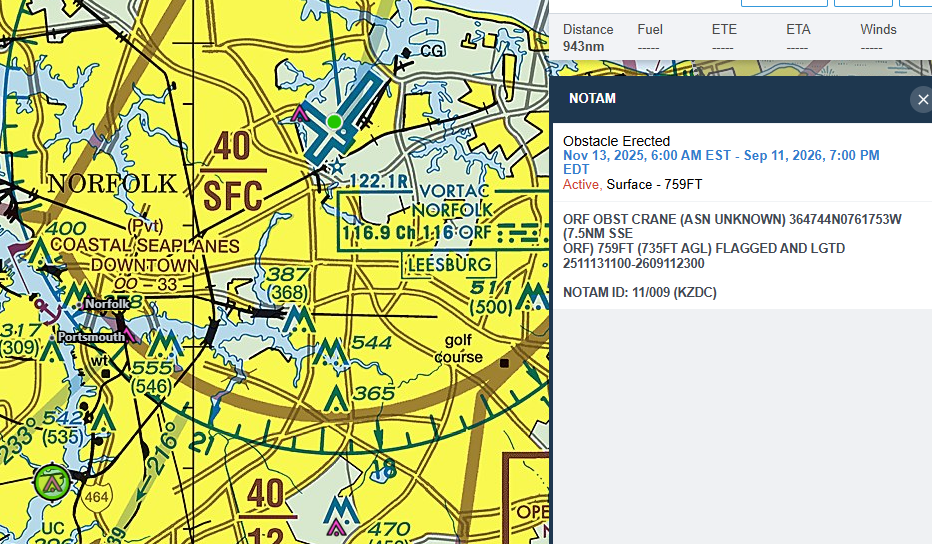 ...well it's a good thing they do, because while the lat/long for this erected Obstacle is correct, the human readable description "7.5NM SSE ORF" is absolutely not. So Foreflight displays the obstacle icon correctly (since none is charted on the sectional), but notice this obstacle sits Southwest, NOT South-South-East of ORF like the NOTAM text actually reads. Funnily enough too, I only know this to be wrong because I know exactly the structure being constructed, having flown to the job site multiple times. Knowing it otherwise would actually be impossible, because the crane the NOTAM is talking about doesn't even exist yet. If you fly to this area, you'll find no-such 735ft AGL crane. So every time I fly over this spot I only know there is a potential crane in the area, but it has yet to appear in the 4 months the NOTAM has been active. I hope I actually remember this NOTAM the day the crane does decide to appear.